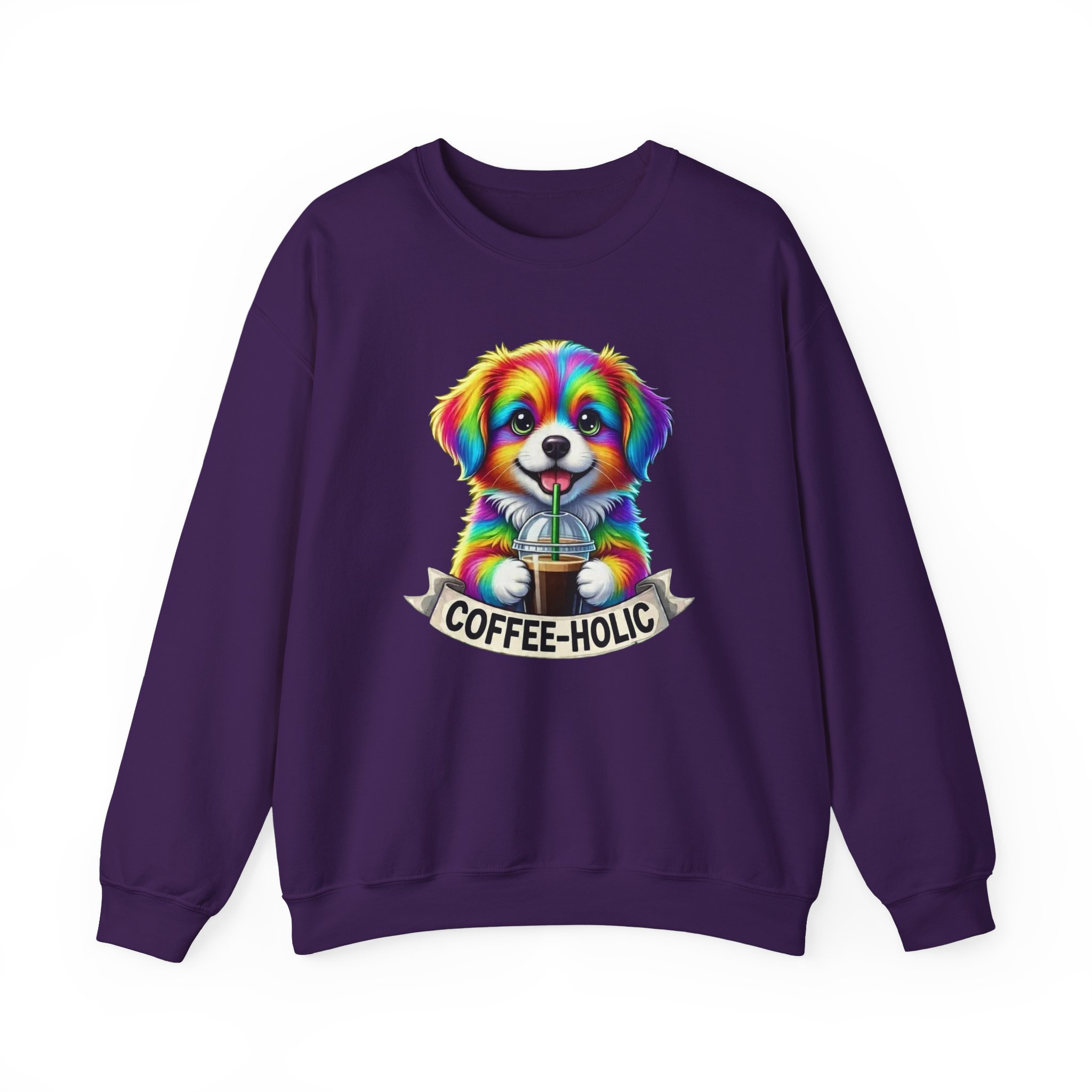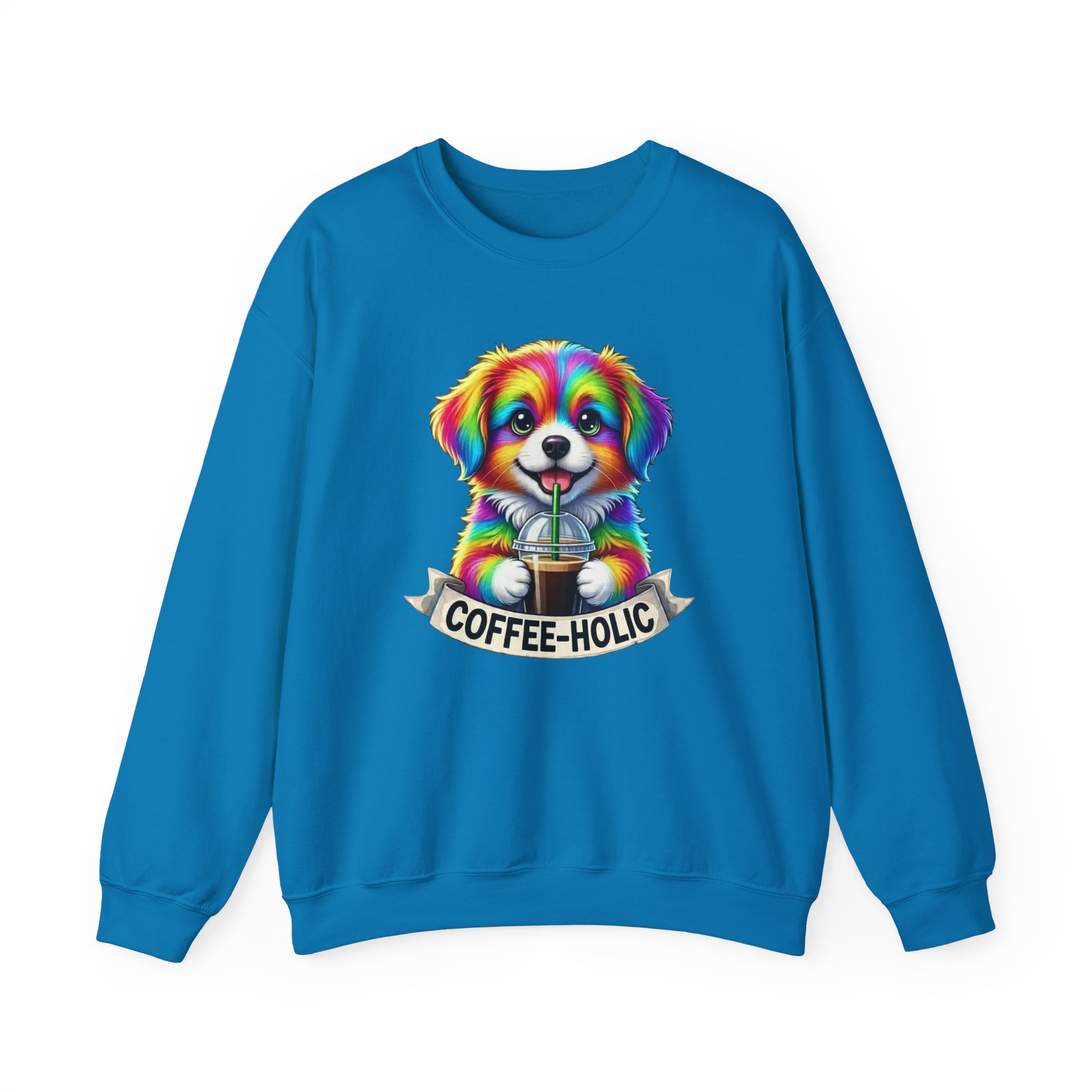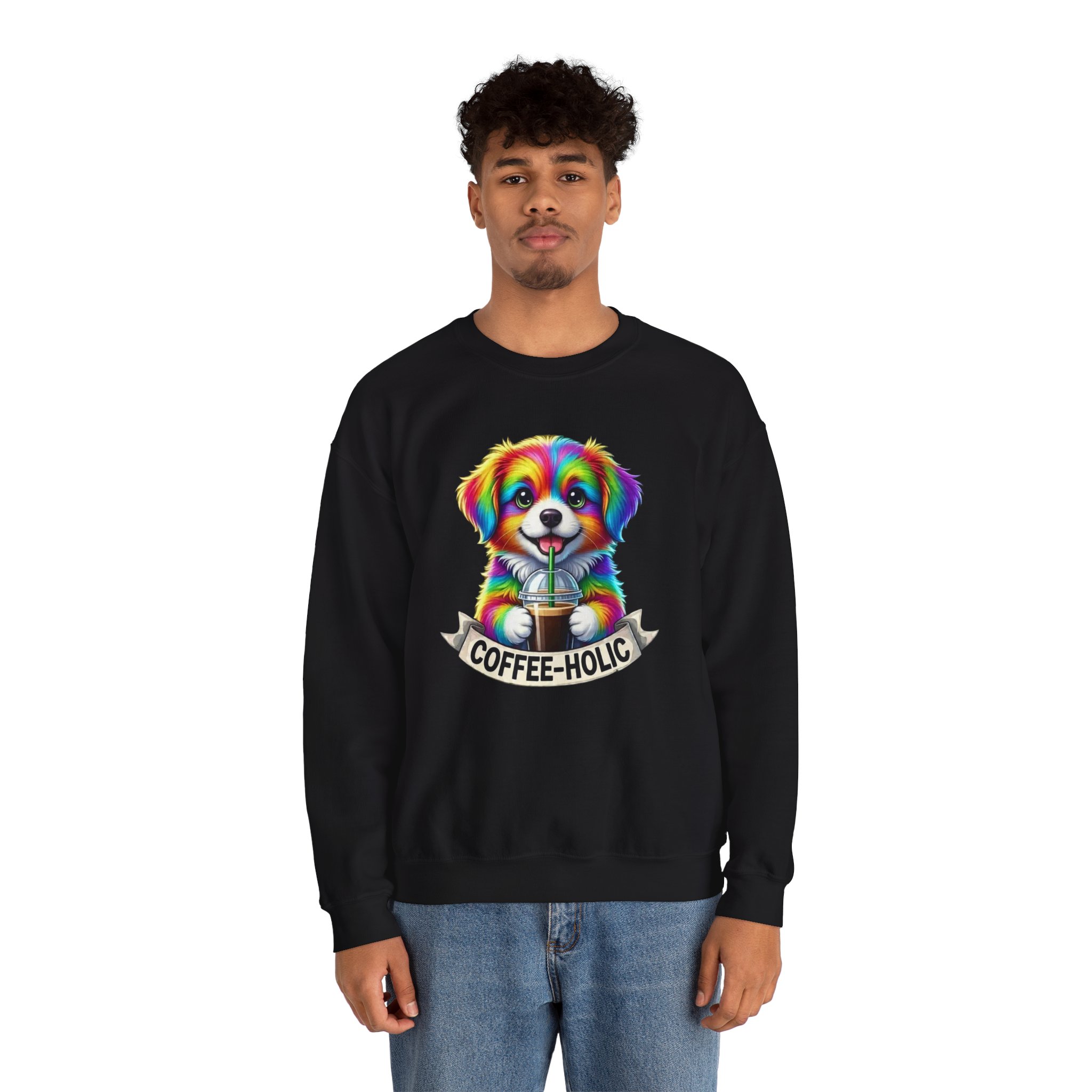 Cozy, colorful, and full of personality — this crewneck sweatshirt brings a playful burst of life to slow mornings and city strolls alike. A bright, rainbow-hued puppy clutching a takeaway coffee sits centered on a soft black canvas, with a cheeky “COFFEE-HOLIC” banner beneath. The medium-heavy cotton-blend holds its shape while the ribbed collar and double-needle stitching promise lasting comfort. Wear it on cool café mornings, dog-walk adventures, or relaxed weekends when you want to signal your love of caffeine and cute companions without saying a word.