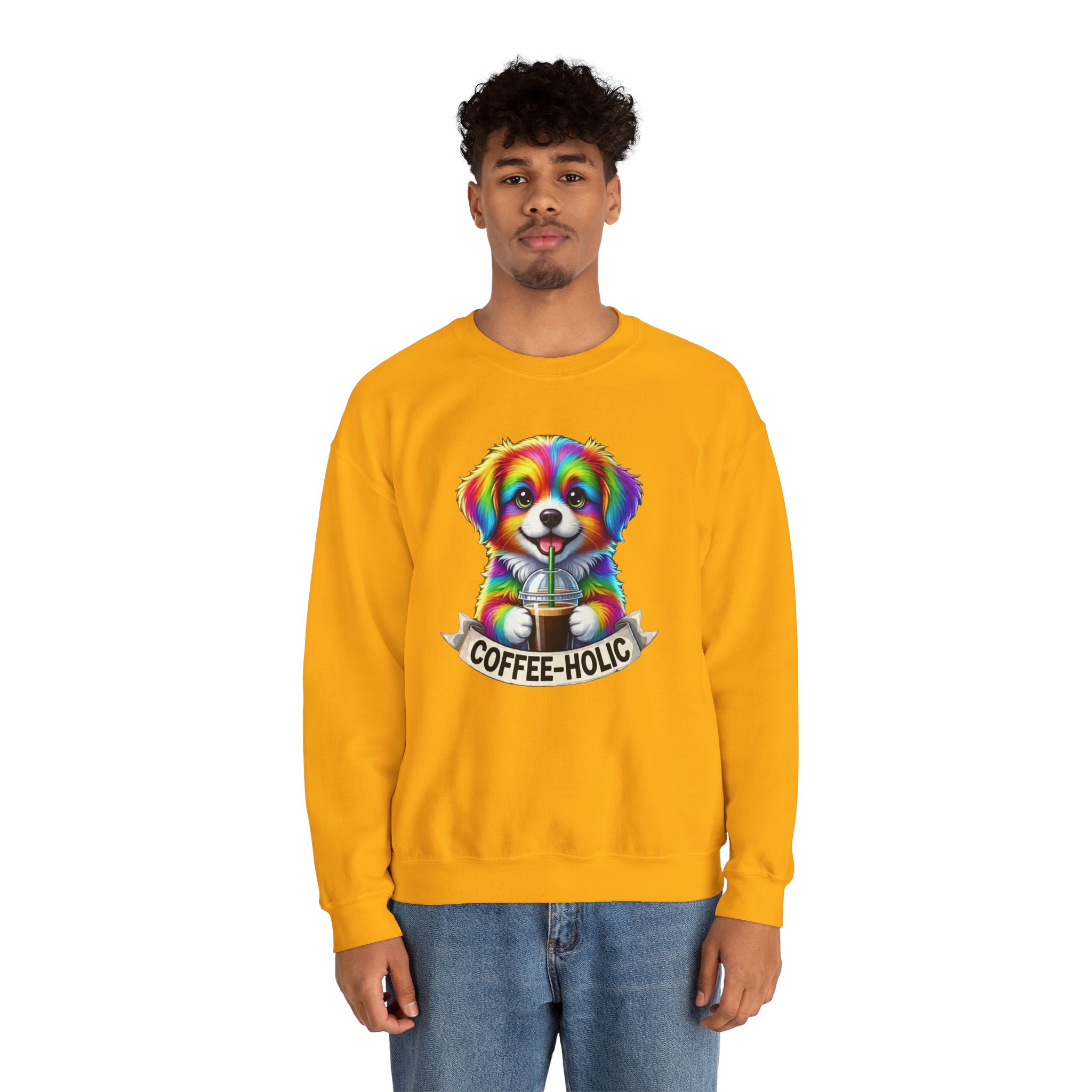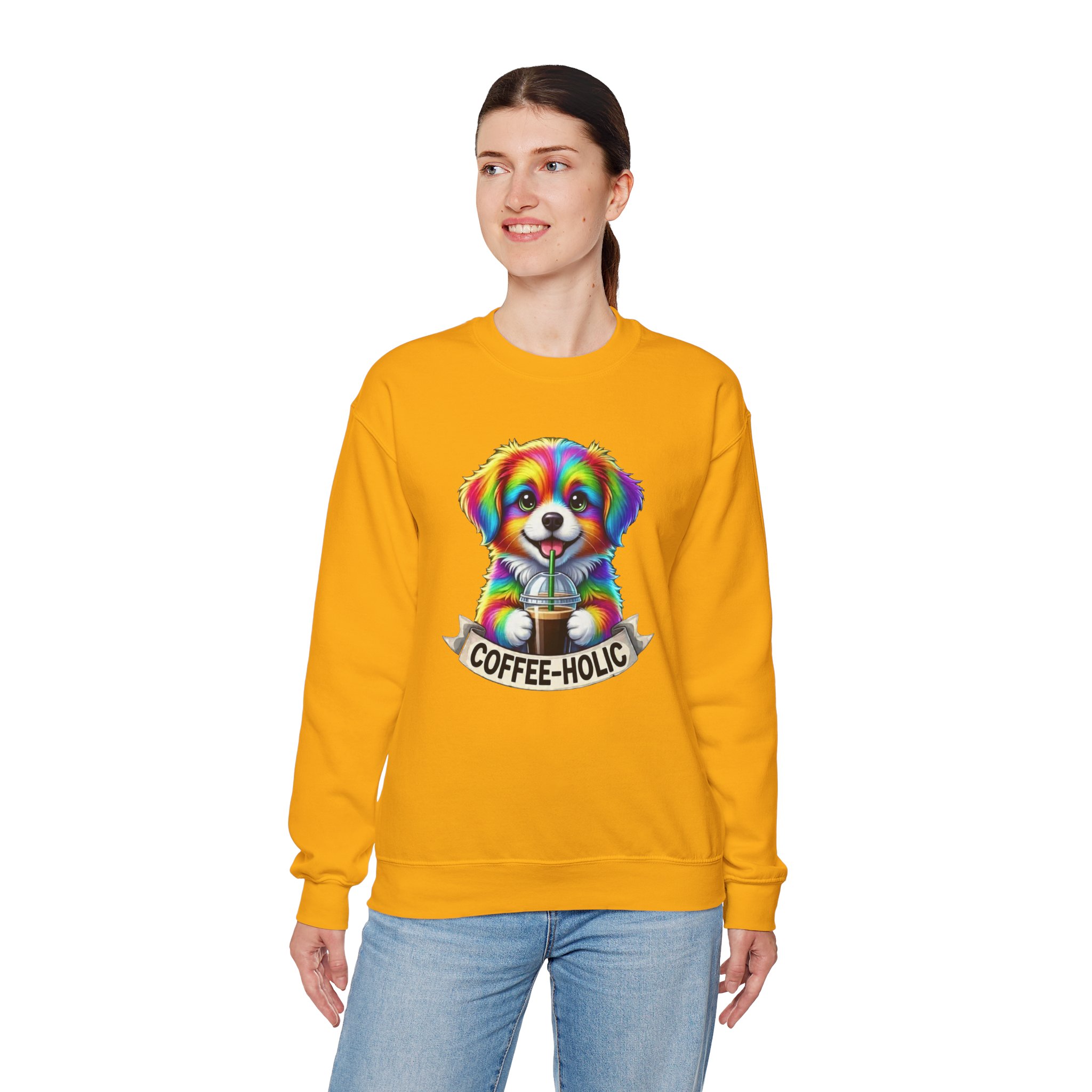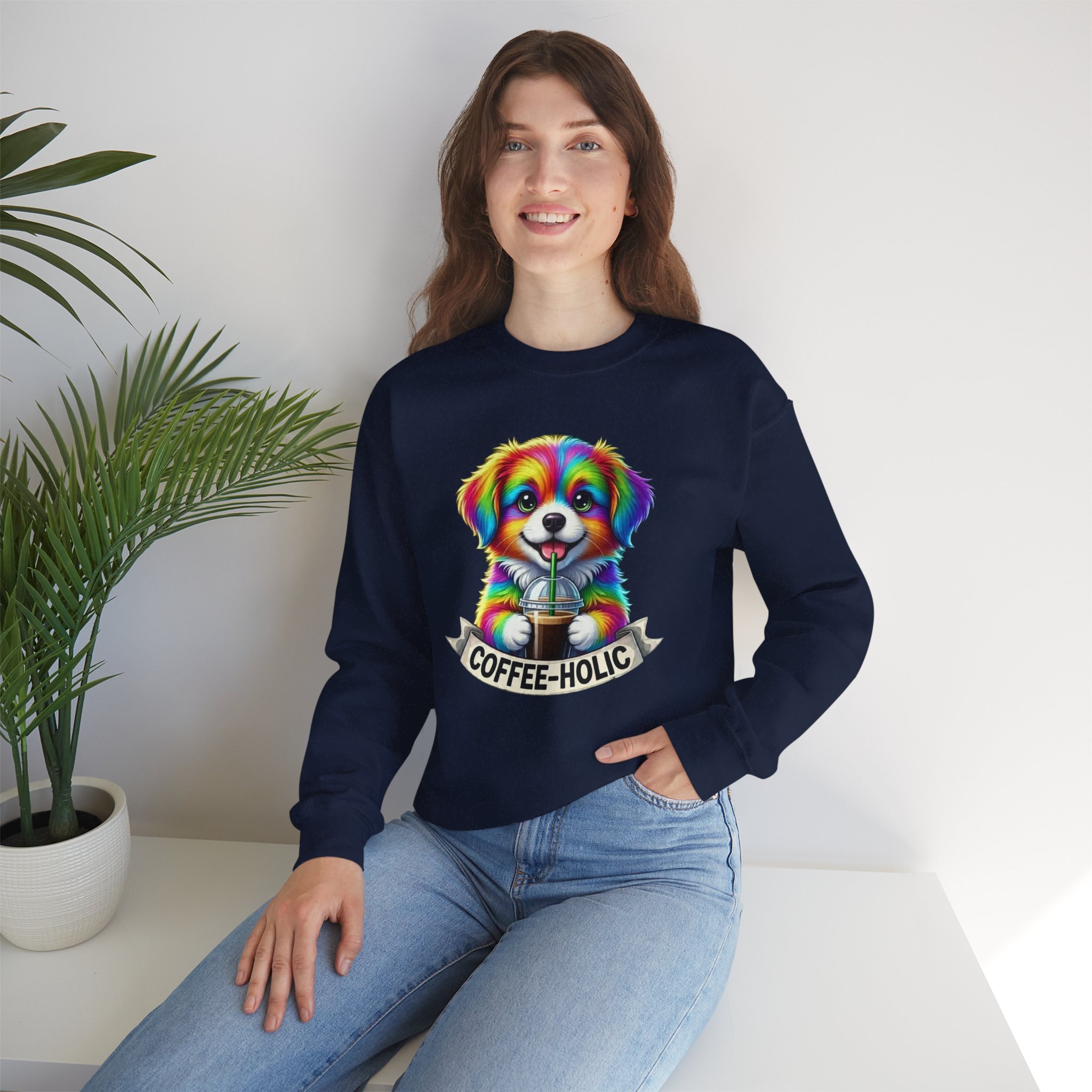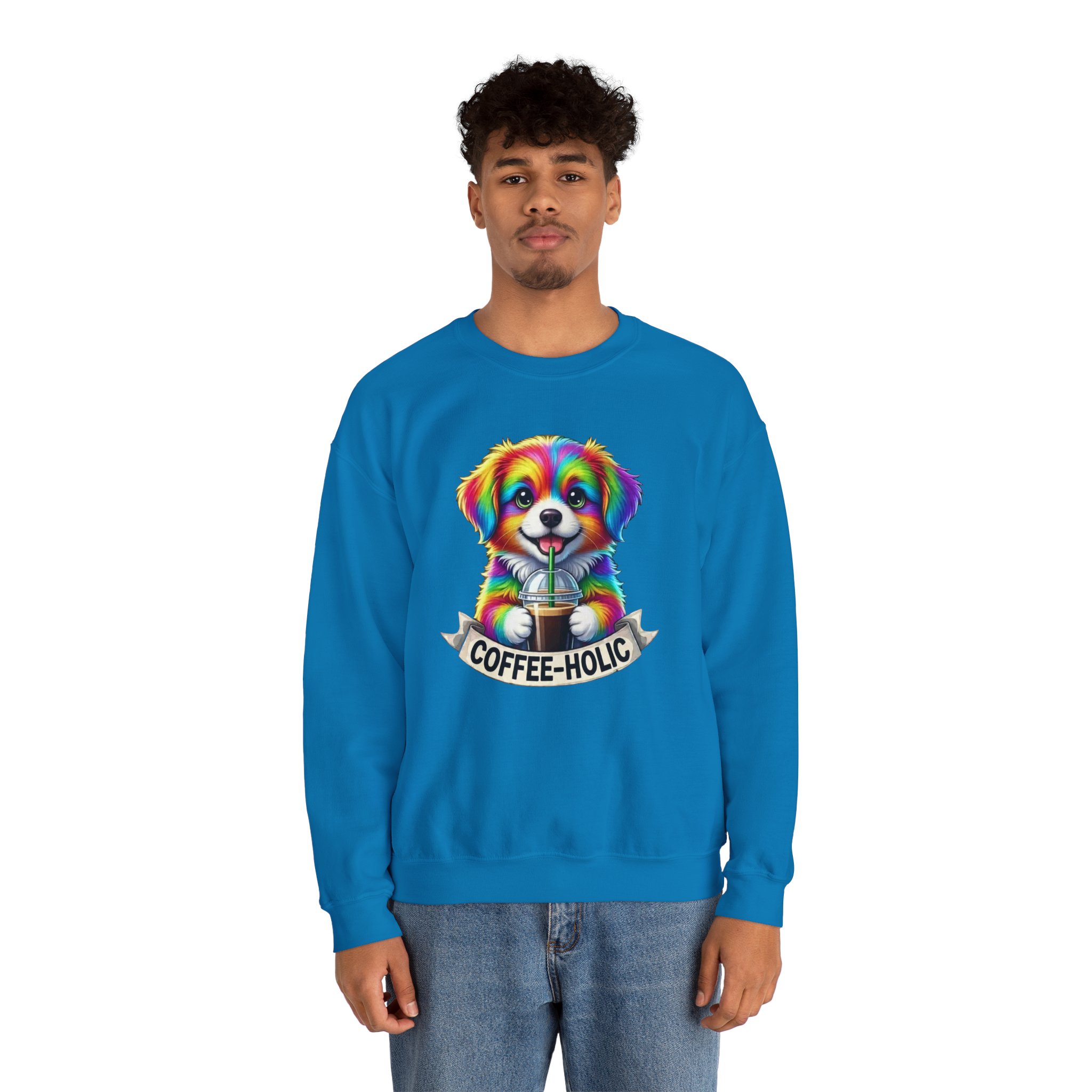 Cozy, colorful, and full of personality — this crewneck sweatshirt brings a playful burst of life to slow mornings and city strolls alike. A bright, rainbow-hued puppy clutching a takeaway coffee sits centered on a soft black canvas, with a cheeky “COFFEE-HOLIC” banner beneath. The medium-heavy cotton-blend holds its shape while the ribbed collar and double-needle stitching promise lasting comfort. Wear it on cool café mornings, dog-walk adventures, or relaxed weekends when you want to signal your love of caffeine and cute companions without saying a word.